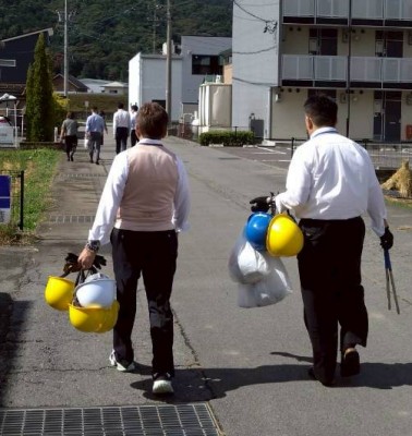 「暑い!」と脱ぎ捨てられた全員分のヘルメットを運ぶ弊社代表と弊社副社長です。