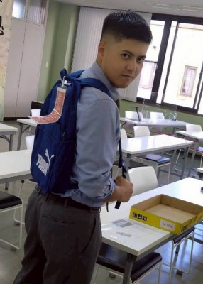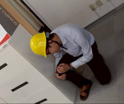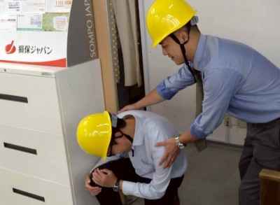 急いで机の下に入って頭を守ります。手が届く場合はヘルメットも着用します。